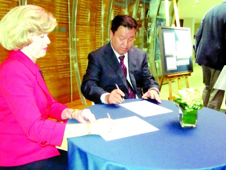 张斌(右)与怀特赛德正在签署该项基金的相关文件。(明报记者摄)