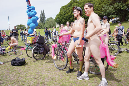一年一度的温哥华裸体骑单车活动,昨日在温哥华市中心海边举行,吸引逾百市民衣衫尽除前来参加,宣传减少碳排放的环保理念。有首次参与的华裔市民到场后感到害羞,临时决定穿上底裤,不敢与其他人一样全裸骑单车。