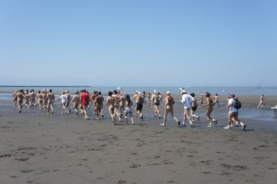温哥华卑诗大学(UBC)旁天体胜地沉船湾海滩(Wreck Beach)21日午间热闹非凡,第17届“沉船湾裸跑比赛”(Wreck Beach Bare Buns Run)艳阳下热闹举办,约百人参加全长5公里的裸跑,其中不乏华人面孔,但以男性为主。