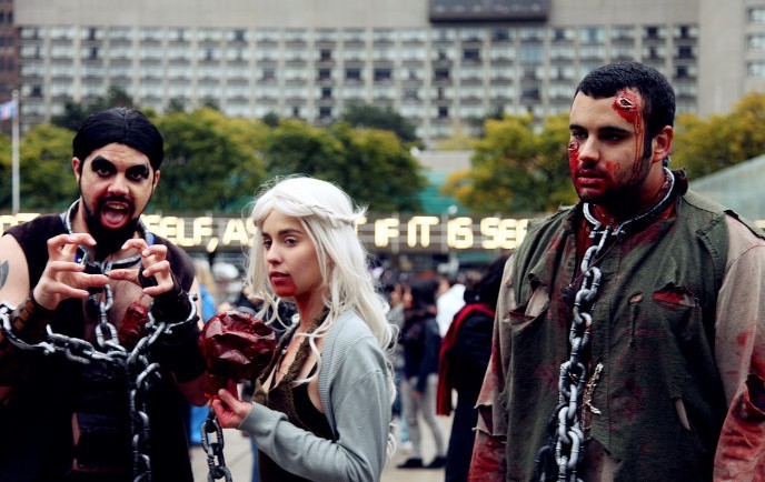 10月26日下午,天色阴霾,多伦多全城僵尸出动,从四面八方涌入西皇后街市政厅广场。游行队伍从广场出发,沿Bay街往北到Grenville,然后向东到央街,向南经过伊顿中心到西皇后街,终点又回到市政厅广场。