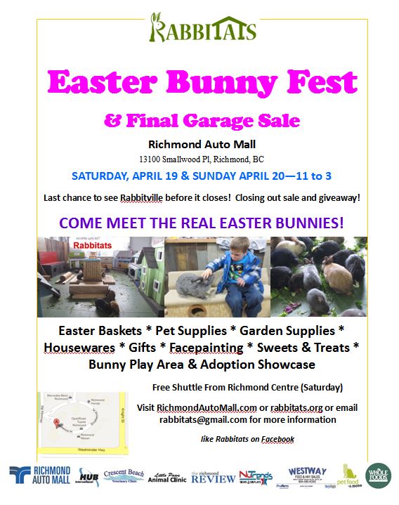 列治文车城之前由于有不少人在车城范围内遗弃兔子而造成安全隐患和困扰。因此本周末Rabbitats将于车城举行慈善领养和义卖活动,帮助大约50只从车城里捕捉的小兔子们找新家。