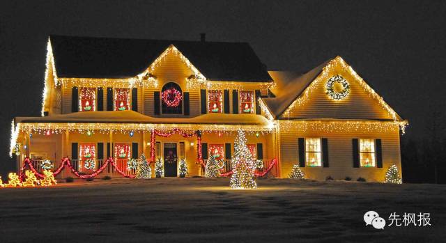 自家门前的圣诞灯展,从围栏到屋顶,院内插满各式彩灯,灯火辉煌。