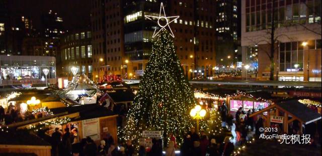 五彩灯饰与圣诞树做背景,社区活动、烟花汇演、圣诞合唱团都在这里举行。