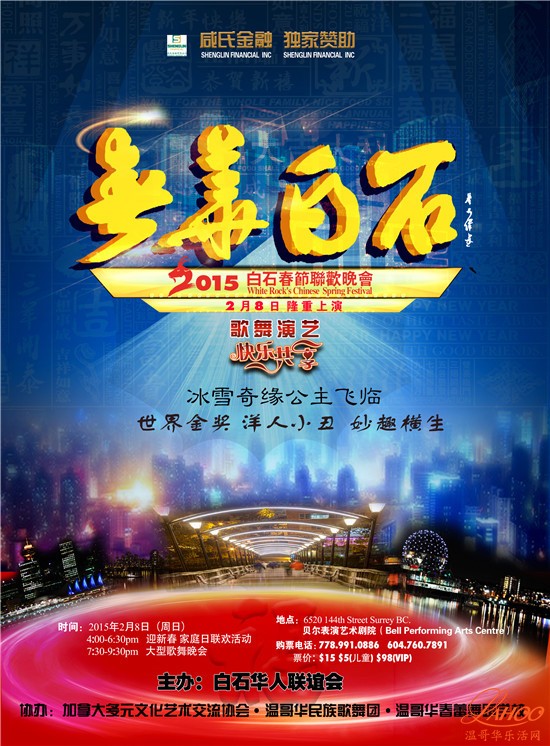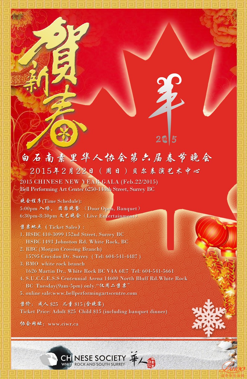 由白石南素里华人协会(White Rock &South Surrey Chinese Society)独家主办的白石南素里第六届贝尔春节晚会,将于2015年2月22日在素里贝尔表演艺术中心隆重举办。