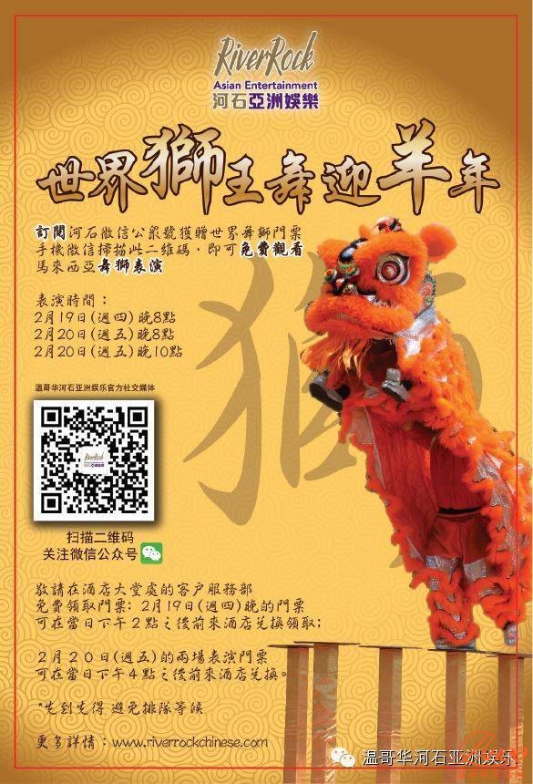 河石第11届“世界狮王 舞迎羊年”的新春大庆典。特别邀请马来西亚荣获“世界舞狮大赛”冠军的9支舞狮团,逾80位专业舞狮者将跨年进行狮子点睛和舞狮祈福新年。当晚7点舞狮开始,门票全免!当晚还将有各种温哥华本地的精彩杂技、歌舞表演,以及新年大抽奖!