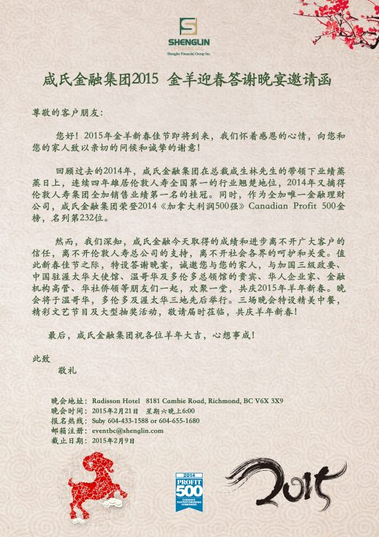 2015年“中华风 加国情”新春千人团拜宴会将于2月19日正月初一晚6点30分假温哥华富大海鲜酒楼举办。本次活动是由加拿大东北总商会、加拿大中国工商联合会和深圳联谊会联合主办,多家机构协办的联谊活动。届时,来宾们将会在欢歌笑舞的气氛中欣赏精彩的歌舞表演,品尝具有地方风味的小吃和佳肴,抽取各式大奖,与政要密切互动,以及与参会的商贾洽谈合作商机。