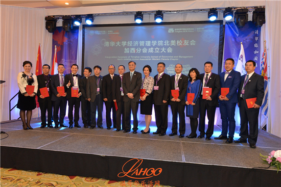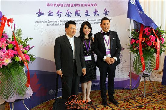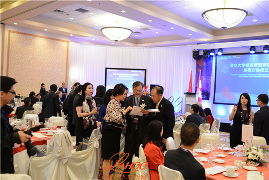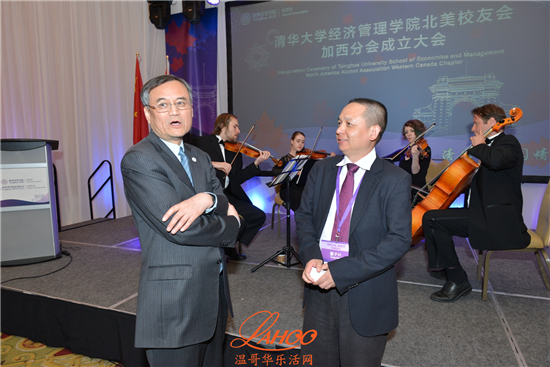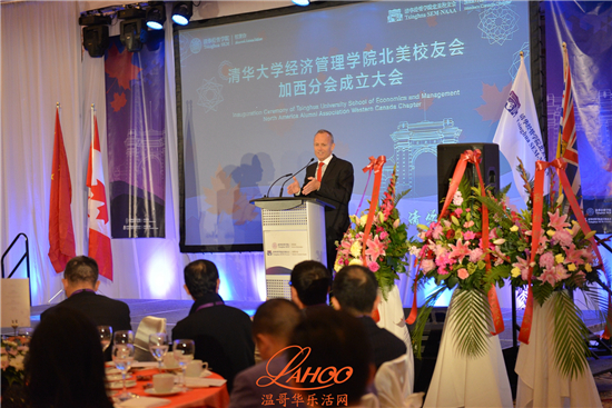 温哥华总领馆教育组参赞于长学, 温哥华市代市长市议员雷建华,香港特区政府驻加西首席专员袁黄洁玲, 加拿大前外贸部长Stockwell Day, 本拿比市议员王白进,加拿大驻北京前文化参赞SFU教授王健, UBC教授 Yves Tiberghien, 对外经贸大学加拿大校友会会长王元珑, 复旦大学加拿大校友会会长殷涛, 浙江大学温哥华校友会会长姜玮清, 长江商学院加拿大校友会会长罗志兰, 中台五所交大加拿大校友联合会会长刘毅,贸易发展部温哥华地区贸易专员Lindsay Margenau ,BC省国际贸易和亚太战略部副部长Clark Roberts, 温哥华经济贸易委员会总裁Ian Mckay, BC省高教厅助理副厅长Ramona Soares 等。当地的中欧校友会及北大校友会都有代表出席祝贺。出席的嘉宾还有温哥华当地金融界,商界和文化教育界的知名人士以及在加西的清华经济管理学院的校友数十人。