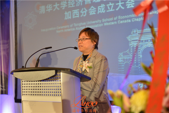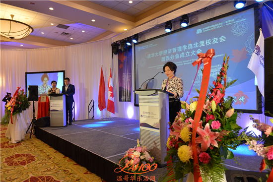 揭牌仪式后致辞的是清华经济管理学院北美校友会加西分会会长付敏英女士。作为一名成功的企业家, 她表示加西分会将继续发扬秉承“自强不息,厚德载物”的清华校训,积极促进校友之间的交流,帮助校友们在加拿大安居乐业, 不断进取, 拓展事业,积极融入主流社会;将在清华经济管理学院校友总会的指导之下, 以实际行动持续提升清华经济管理学院品牌的国内外影响力, 以增强对社会发展的贡献为己任, 为促进加拿大和中国的商贸文化交往作出贡献。