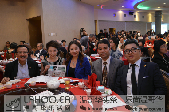 高朋满座,左起:加拿大怡富地产贸易集团主席蔡宏安、镇金店珠宝金行董事严诗诗、巨星舞台创始人徐旭红、加拿大泉州同乡会副会长郭亚欣、半岛酒店总裁王滨