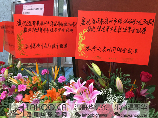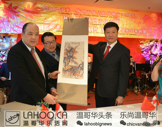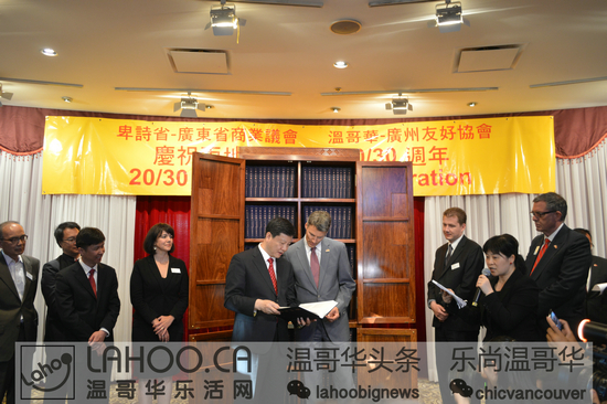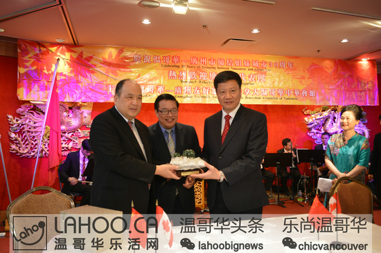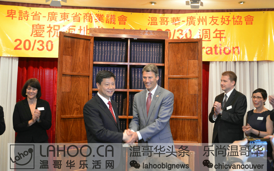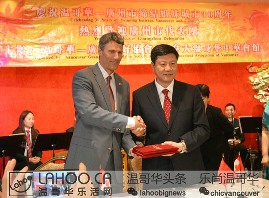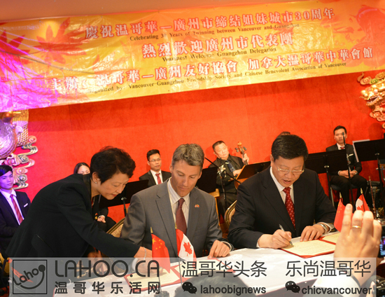 今年是广东省与BC省缔结友好省关系20周年、广州市与温哥华市缔结友好城市关系30周年。为此两地政府设定:分别于两市市长互访期间在两地举行”温哥华周”和“广州周”的活动。两省市会在经贸领域;文体领域;旅游领域进行广泛的交流。2015年6月14日晚,在DOWNTOWN的富大海鲜酒家,温哥华市长罗品信、广州市长陈建华与多位政要人物、华人领袖及华裔共同举办了温哥华市与广州市缔结友好城市30周年庆祝晚会。