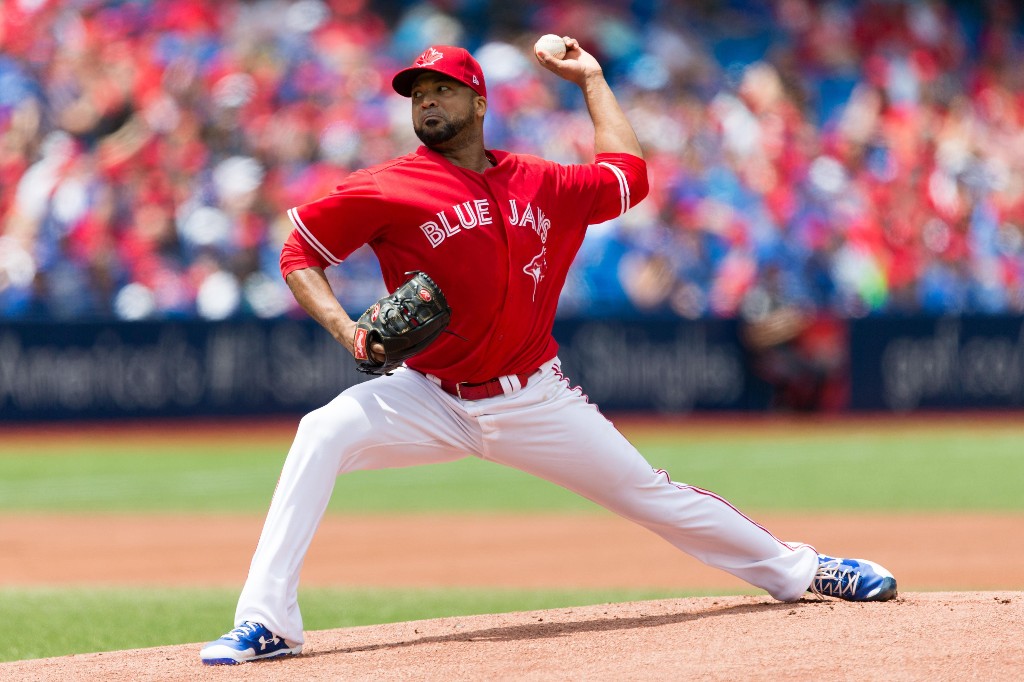 多伦多蓝鸟队(Blue Jays)身着国庆特定的红白队服与波士顿红袜队比赛。