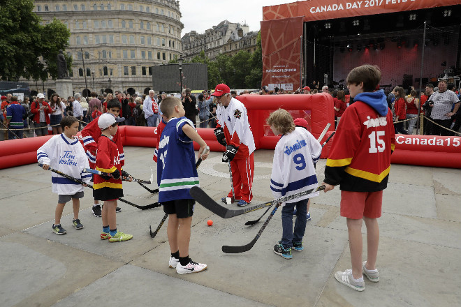 正在向加拿大冰球运动员学习技巧的孩子们。