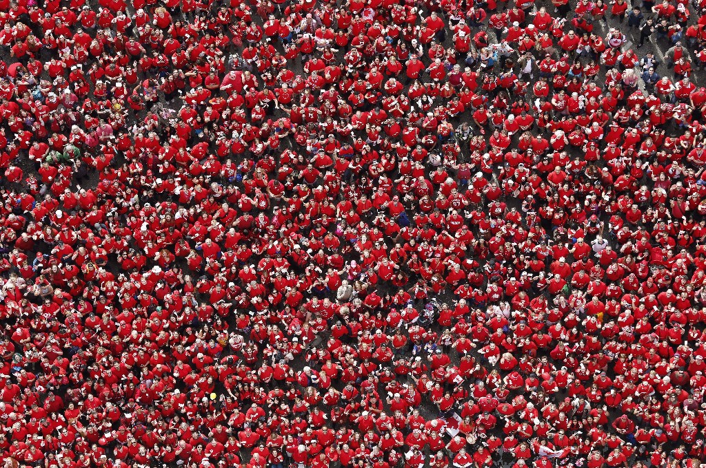 由3600人组成的枫叶图形,下面还有150的字样。