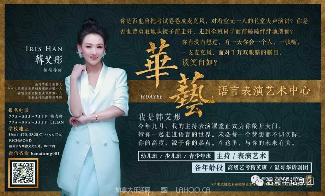 韩艾彤老师毕业于省艺主持表演专业,并在北京电影学院学习表演专业,从师于著名表演艺术家北京人艺演员冯远征,她同时也是加拿大城市电视台晚间新闻节目主持人。著名表演艺术家,北京人艺演员梁丹妮女士担任温哥华话剧团名誉顾问。