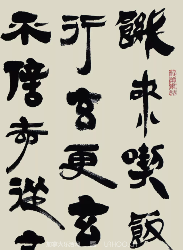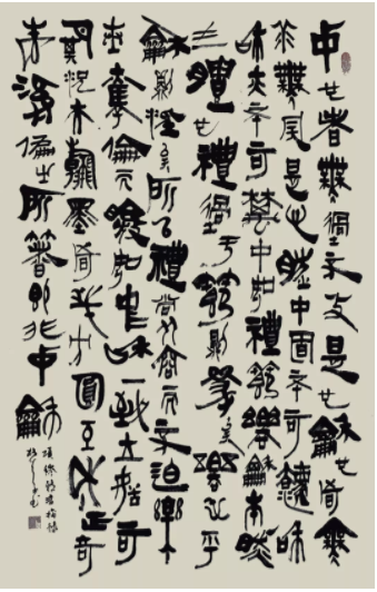 碑简字体原本书于简或刻于石,但使用毛笔在宣纸上创作,如何处理二者的差异,就需要作者自身功力及审美趣味的介入。一方面,他用心于如何完成转换,使碑简古文字的特质在宣纸上得到完美呈现,凸显手写刀刻字体“平而不平,直而不直,似连非连,似断非断” 的特征;另一方面,他也注意发挥毛笔和宣纸本身的特点,适当融入帖学书法技巧,于古拙中求新意。纵观樵夫用笔,捺笔,竖笔和勾笔常有夸张的拖长,转角多用圆笔,运笔连贯流畅,不见棱角而内力暗藏,这正是得自楚汉碑简的功力,而其疾速运笔时常现飞白,不拘中锋侧锋,极尽笔锋变化,又不难看出其中融行草于隶篆的新意。另外,樵夫在结体上亦诸多用心,求新思变,他的作品中,同一字之结体常常极尽多样,变化无穷,章法错落有致,字体大小,间距,墨色浓淡,左右重心常有微妙排布,让人感到一种毫不夸张却恰到好处的节奏感,平和而不平淡,端庄而不板滞,不徐不疾,动静相宜。