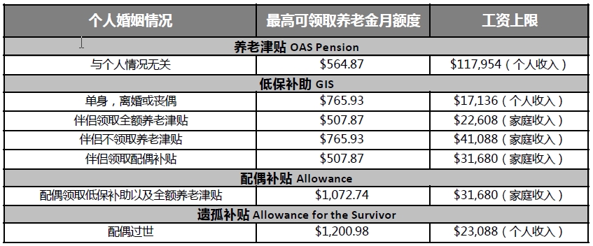 从今年七月开始,加拿大政府颁布了最新的养老金可领取最高额度,如下表: