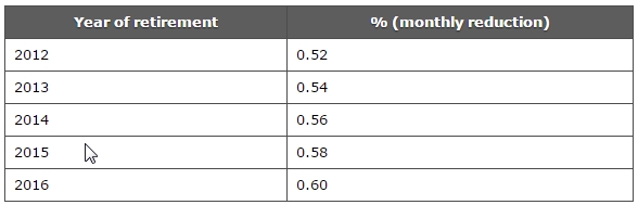 ①65岁之前开始领取CPP的话,每个月都会扣去一定的百分比。从2012年到2016年需扣除的百分比都不同,如下表: