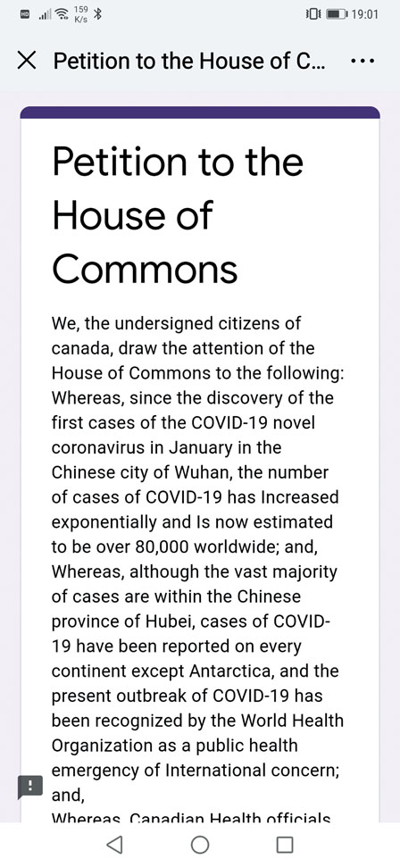 敦促加拿大国会采取更强更有力的行动、以防止新冠病毒爆发的请愿书正在互联网上流传。这些在线请愿书正在诸如Facebook之类的社交媒体网站上共享,用户可以在其中通过填写在线表格来签署请愿书。