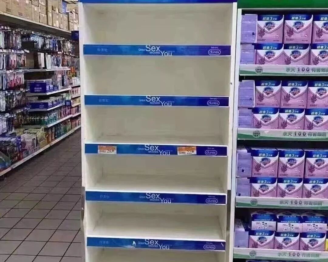 但有意思的是,另一个与之相反景观是——疫情中,超市里的避孕套,早就全部脱销了。