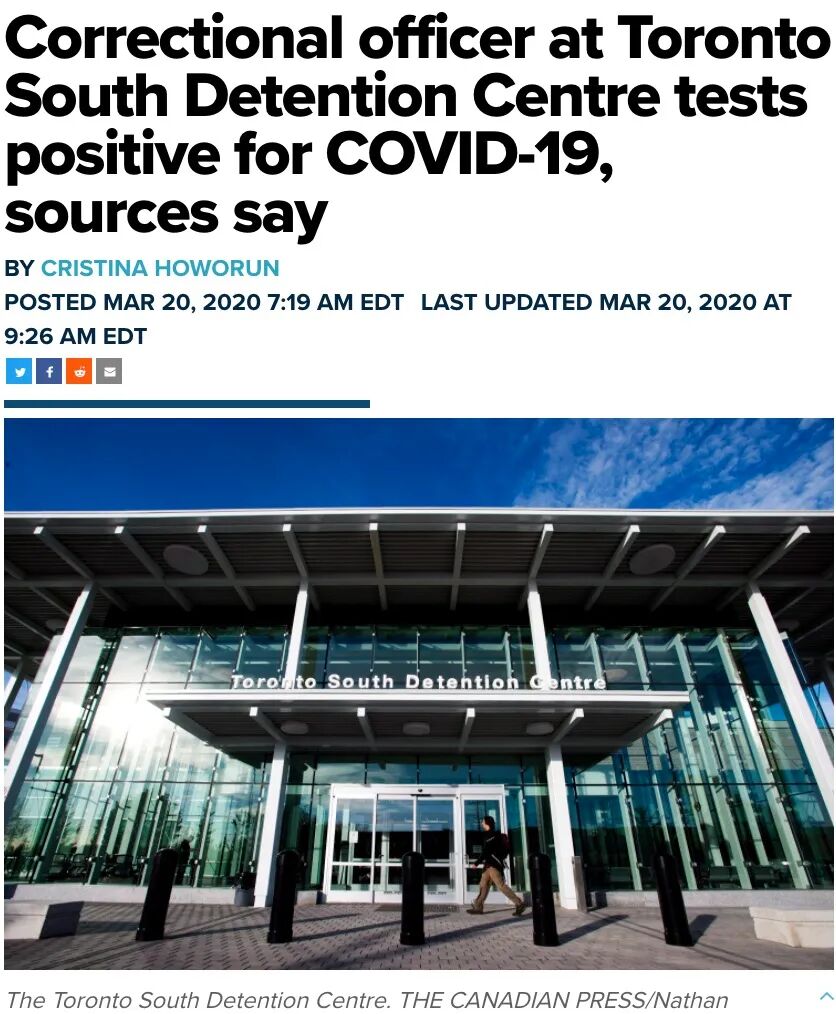 加拿大出现第一例监狱看守感染新冠肺炎2020-09-09 |作者: | 来源:多伦多Loading...分享: 多伦多新冠高峰爆发期 机场边检人员、警局工作人员、 TTC司机和Go Bus乘客均有感染人员。 据City News报道, 多伦多Etobicoke南部监狱(Toronto South Detention Centre) 一名看守人员检测出COVID-19阳性 感染新冠的这名男子目前已在医院隔离接受治疗。 这也是目前安省首例监狱看守人员确诊病例! 这名男子曾去过欧洲, 返回加拿大后直接复工开始工作, 而不是自愿在家隔离14天。 就在世卫组织(WHO)宣布病毒大流行的时候他才回家自我隔离, 不幸的是,周四的检测结果为COVID-19阳性。 检测结果公布后, 之前与他有过接触的其他工作人员也被要求隔离。 这名男子从欧洲返回多伦多工作后, 在监狱不同区域工作,而且接触了不同的囚犯; 即使一些囚犯目前正在监狱医务室进行隔离, 依然不能确定多少囚犯与这名男子有过接触。 据相关消息称, 安省公共卫生部门今天(3月20日)将对监狱展开全面调查, 近日,该监狱也可能将关闭一段时间。 监狱可以说是新冠病毒传播的温床, 很少存在真正意义上的社会隔离; 监狱看守人员必须要与囚犯保持密切的联系, 尤其囚犯入狱都要仔细搜身检查。 虽然囚犯看似关在了铁门之后, 但其实也很少有个人单独关押 通常都是与其他囚犯关押在一起。 所以囚犯与囚犯、囚犯与看守人员之间, 根本没有可能做到完全的社会自我隔离。 直到本周早些时候, 规定惩教人员不论是否有旅行史都要求到岗, 除非已经出现了不适症状。 直到周四,才修改这项规定; (护士或狱警)这类工作人员, 除非对工作运作有至关重要的影响以外, 都要求隔离14天后再返工。 为了控制病毒在安省监狱中传播 总检察长上周公布了一些新措施包括: 增加监狱的清洁和消毒处理、 为间歇或周末提供临时居留证以减少设施使用次数、 为员工提供个人保护装备(Personal Protective Equipment)。 不论是拼搏在一线的医护人员 还是像监狱看守人员这样特殊职业的人 都在病毒爆发的危急时刻为国家做着贡献 所以大家一定要坚持住自我隔离 做好自我防护措施 一起挺过危急时刻!! 本文发布于: 2020-3-20 09:42 阅读 未经允许不得转载:加拿大乐活网 »加拿大出现第一例监狱看守感染新冠肺炎分享: