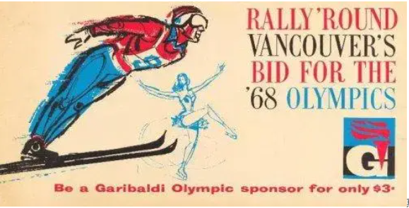 惠斯勒参与申办1968年冬奥会海报,图片来自于惠斯勒博物馆(Whistler Museum)资料显示,惠斯勒分别在1961、1965年参与申办1968、1972两届冬奥会,却因为基础设施跟不上而相继折戟。直到1965年,随着滑雪场的顺利完工,惠斯勒获得了代表加拿大申办1976年冬奥会的权利。然而颇有戏剧性的是,由于加拿大的另一座城市蒙特利尔成功申办了同年举行的夏季奥运会,惠斯勒的申冬奥计划再次落空。
