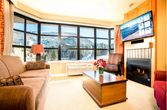 惠斯勒日晷精品酒店(Sundial Boutique Hotel)单卧室套房,推窗即可见彩虹山(Rainbow Mountain)山景,主卧室内有一张可分开的特大号床(King Size),客厅里还有一张大号沙发床,室内设施完善,wifi、燃气壁炉、50寸纯平电视、DVD播放机、空调、厨房、冰箱等应有尽有。这间豪华套房可供4位客人入住,非常适合来惠斯勒旅游的小家庭哟。