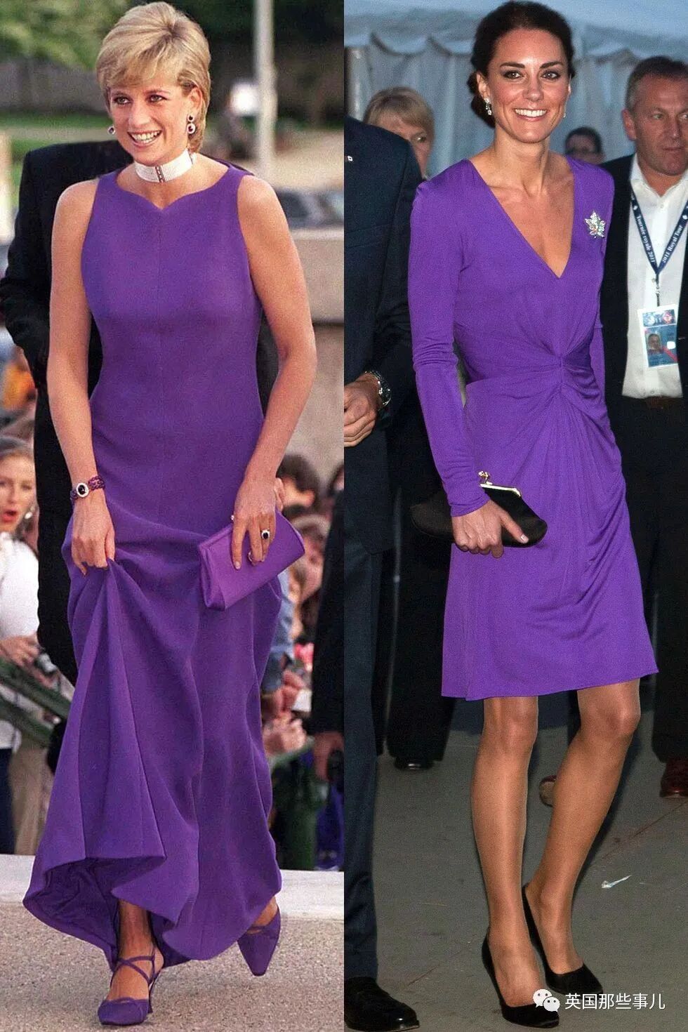 1996年6月,戴安娜王妃穿着Versace的紫色礼服长裙在美国出席活动;2011年7月,凯特穿着同色长裙在加拿大参加活动:↓