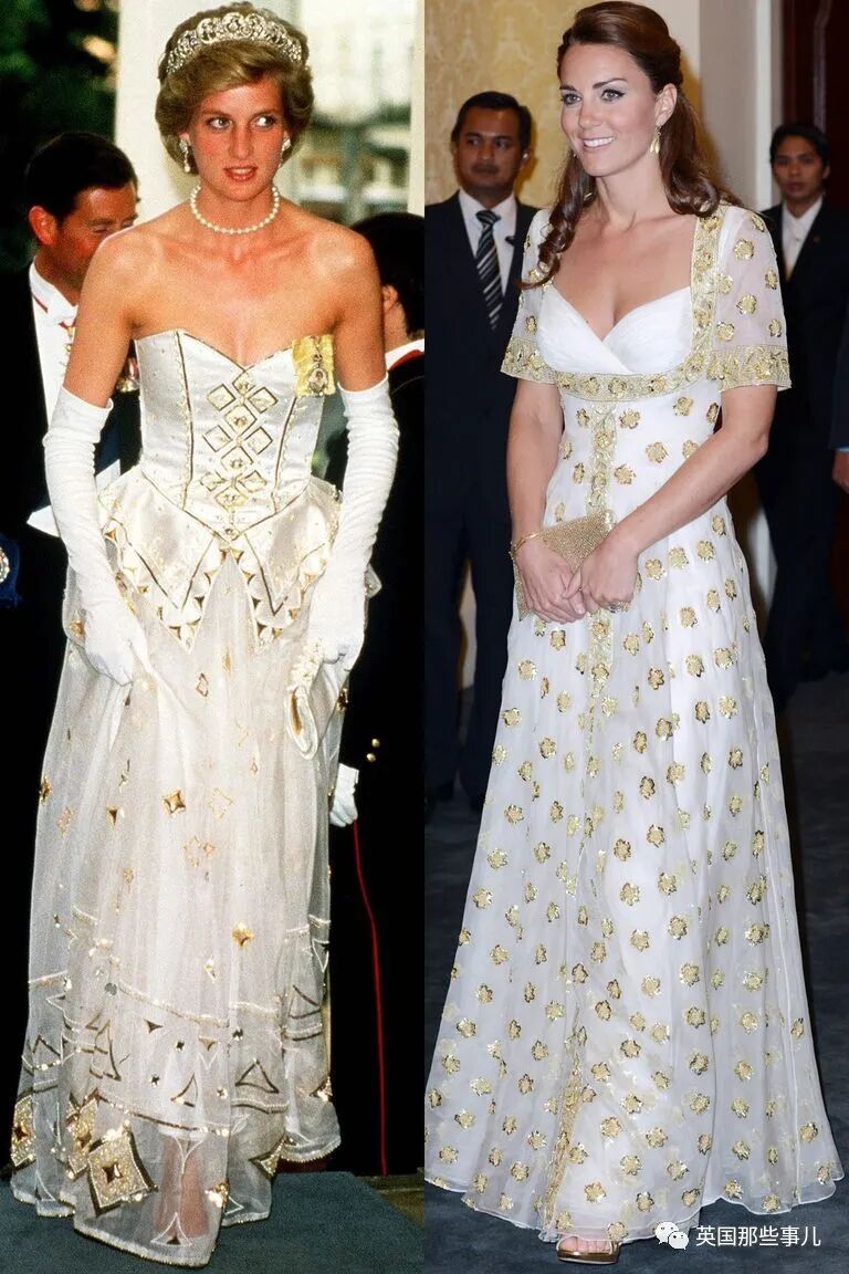 1986年,戴安娜王妃出席德国大使馆晚宴,身穿一件象牙色饰金色亮片的礼服裙;2012年,凯特王妃穿着乳白色饰金色花朵礼服裙出席吉隆坡的官方晚宴: