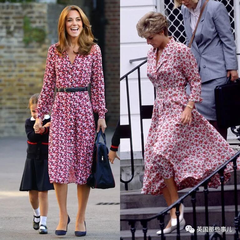 2019年9月,凯特王妃送夏洛特小公主上学的第一天,和戴安娜王妃1992年送哈里王子上学时穿的白底红色碎花连衣裙很像:↓