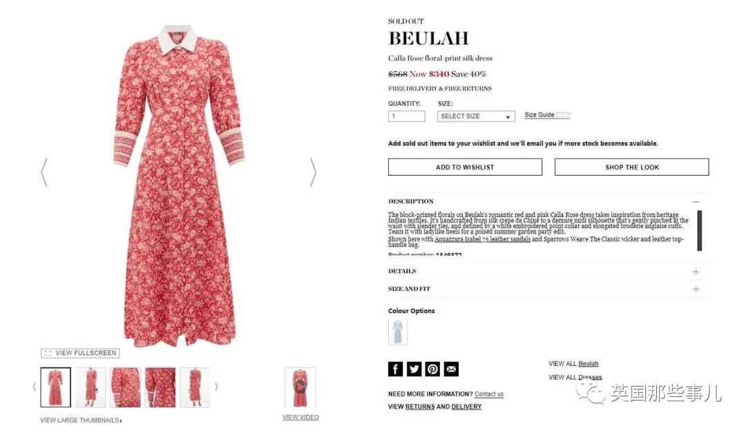 凯特穿的这件连衣裙来自英国品牌Beulah,售价340英镑。被凯特穿过以后,官网秒速售罄: