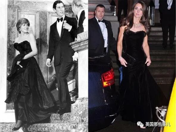 2011年,凯特王妃穿着同款剪裁黑色天鹅绒礼服长裙:↓