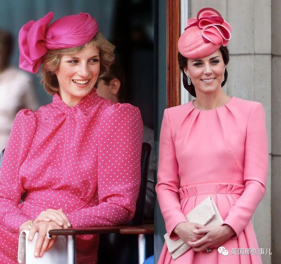 1983年,戴安娜王妃访问澳大利亚珀斯时穿了一件粉色波点连衣裙配俏皮感礼帽;2017年,凯特王妃在皇家阅兵仪式上身穿Alexander McQueen的相似款礼服裙。↓