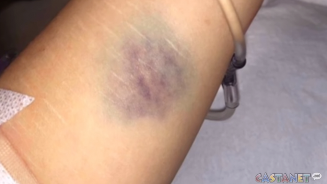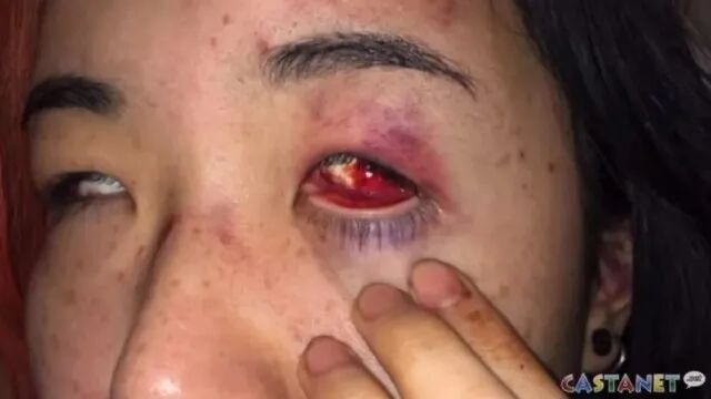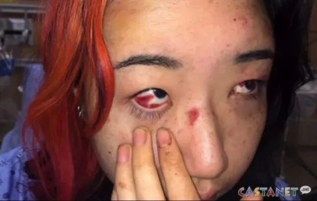 Mona Wang在医院拍的照片。除身体淤青外,她的太阳穴和眼角膜也全部红肿,部分伤口还在渗血。图源:Castanet News