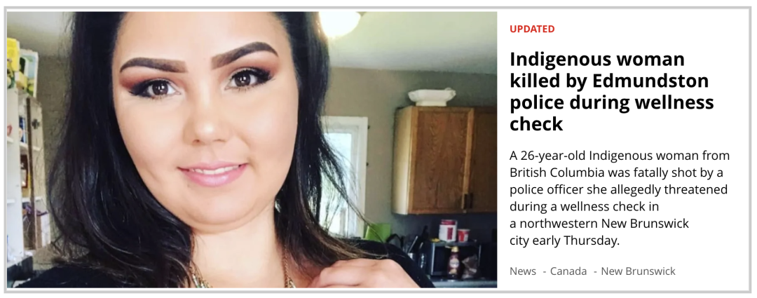 近期,同样性质的事件在原住民群体中也上演过。6月4日凌晨,一名来自BC省温哥华岛Tofino的26岁原住民女性,在新不伦瑞克省Edmundston市接受“入室检查(wellness check)”时,突然被警察乱枪击毙。起因是她远在异地的男友担心女友安全,请求警察上门帮助查看。谁知女友听到声响后以为有人来袭,于是举起一把刀走到了门口,瞬间被警察以自卫之名击毙。