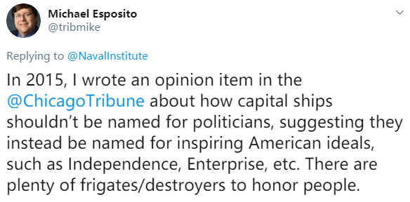 也有人是认为美国很难找出一个不是种族主义者或是性别歧视主义者的领导人物,认为以前美国就是这么一个国家,而这些领导人物也都来自这样的人群。对此,有人就建议可以考虑用美国的地名或是价值观给军舰命名,比如独立号、企业号等等。