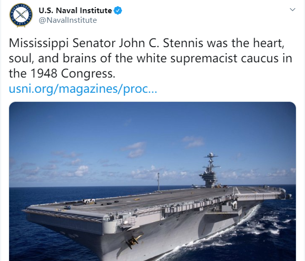 所以,在因遭警察暴力而死的美国黑人男子乔治·弗洛伊德点燃了美国目前这一轮的反种族主义浪潮后,美国海军已经退役的黑人少校鲁本·格林(Reuben Keith Green)便在美国海军学院(U.S. Naval Institute)的网站上撰写了一篇文章,率先提出不该以这么一个曾是美国国会中“白人至上主义者”的“灵魂、大脑和心脏”,且强烈反对黑人平权的人物,命名美国的军舰,称这是美军的“耻辱”。