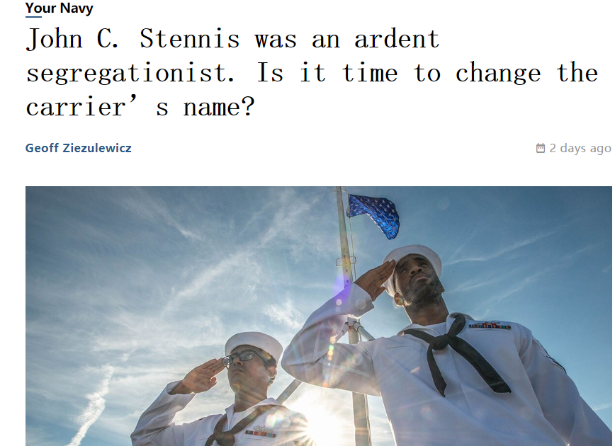 截图为美国海军退役少校格林呼吁给斯坦尼斯号改名的文章