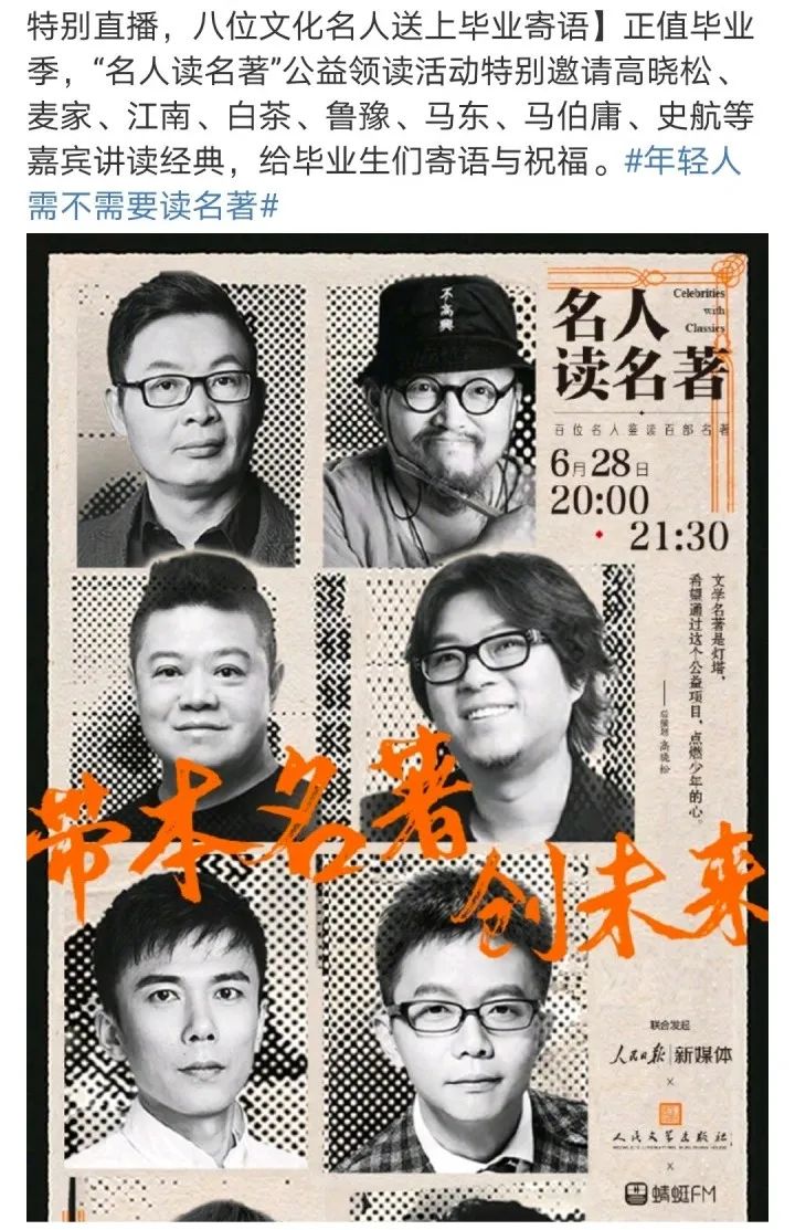 直播开始的前一天,微博上大张旗鼓地贴出海报宣传“名人读名著毕业季特别直播,八位文化名人送上毕业寄语”的直播节目。