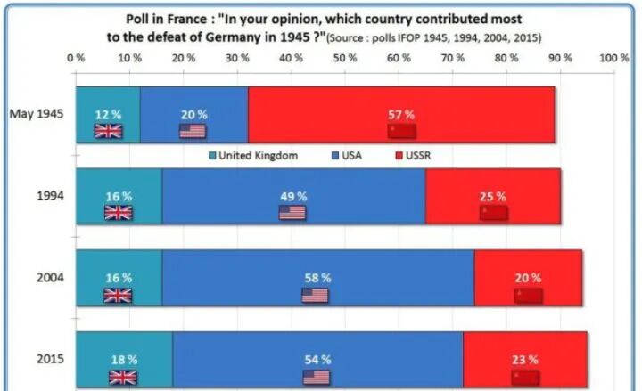 比如这份过去70年来,在法国统计的”人们认为是谁打败了纳粹德国”的民调里。