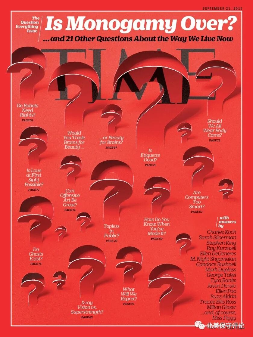 “最新一期的《时代杂志》,封面顶部写着“一夫一妻制是否结束了?”(Is Monogamy Over?)当然,文章报导了不同的意见。(http://time.com/magazine/us/4028984/september-21st-2015-vol-186-no-11-u-s/)