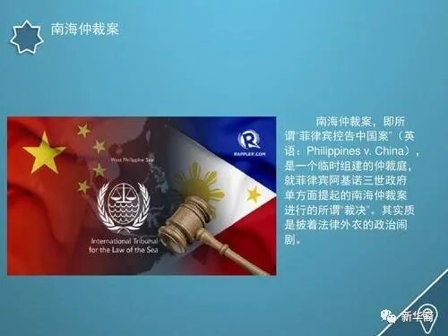2013年,菲律宾以中国违背《联合国海洋法公约》为由,将中国告到荷兰海牙的国际仲裁法庭。中国理所当然拒绝承认该仲裁法庭的管辖权,也拒绝出庭应讯。
