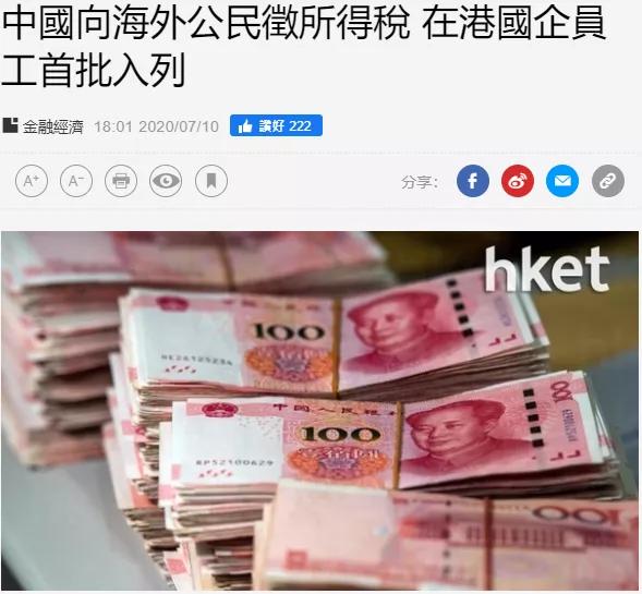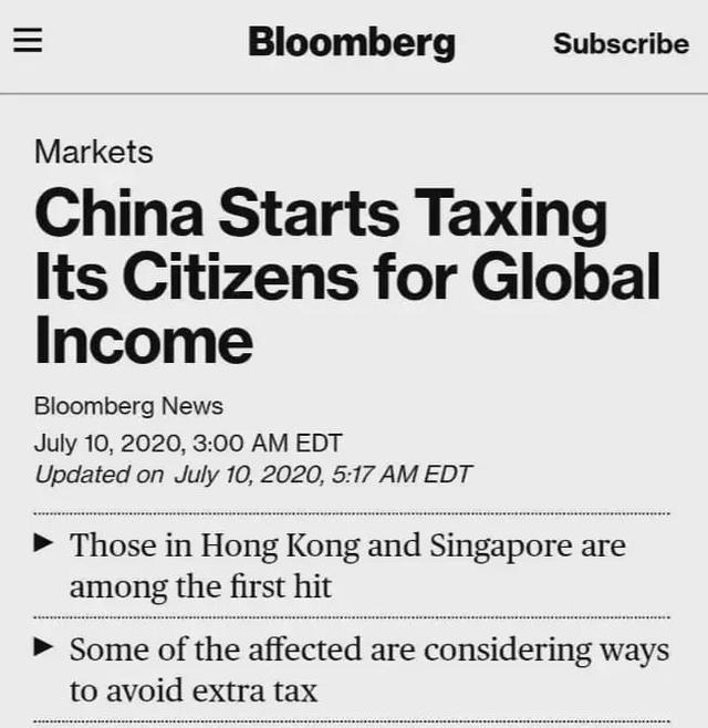 当地时间7月10日,彭博社(Bloomberg)在一则报道中称,中国税务部门已经开始向中国公民的全球收入征税!