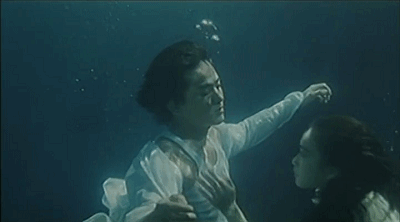 《人鱼传说》中,郑伊健饰演的体育老师阿志溺水将亡,美人鱼钟丽缇用体内的珍珠把他救活了。失去珍珠的美人鱼无法回到大海,因此她只好假扮学生妹进入阿志所在的学校,上演了一幕具有喜感的校园恋情…