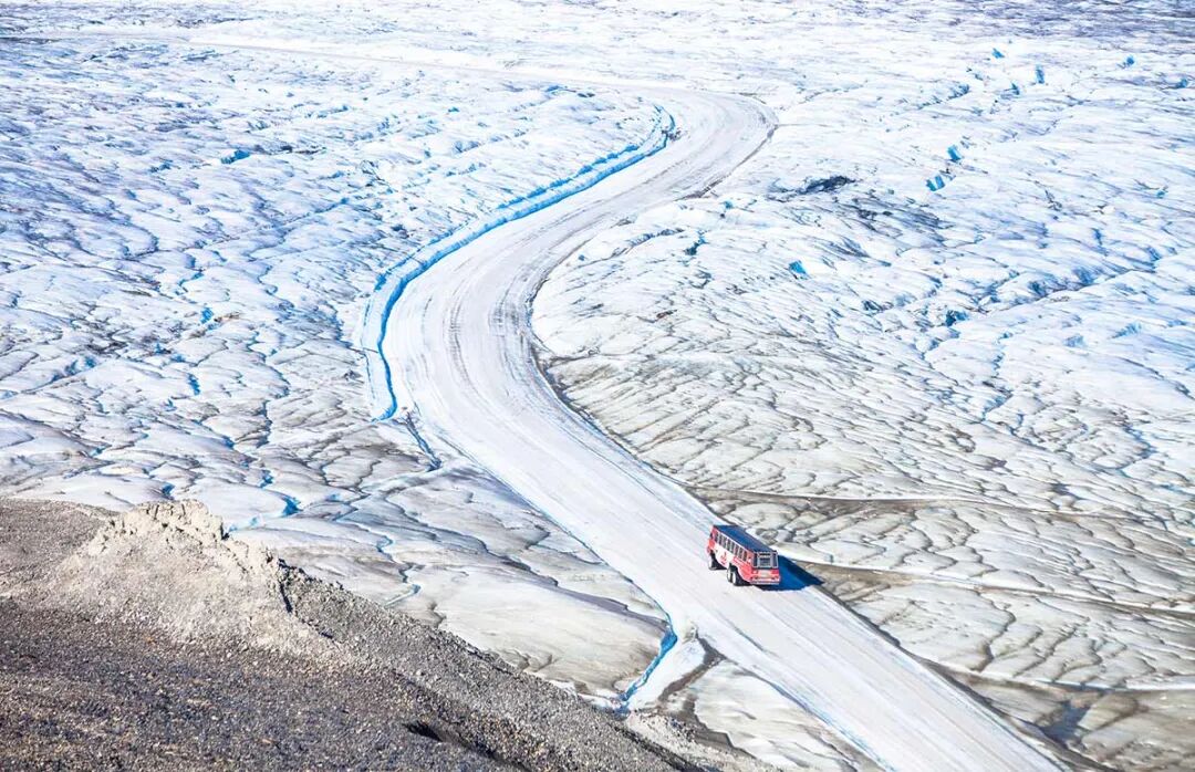 而当地的旅游巴士,也是世界上独有的“巨轮雪车”,旅客将搭乘这辆巴士上到300公尺深的阿萨巴斯卡(Athabasca)冰川,并且在冰川上漫步。
