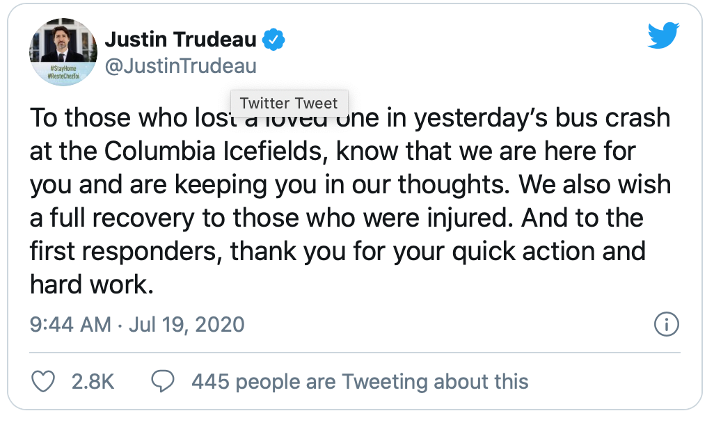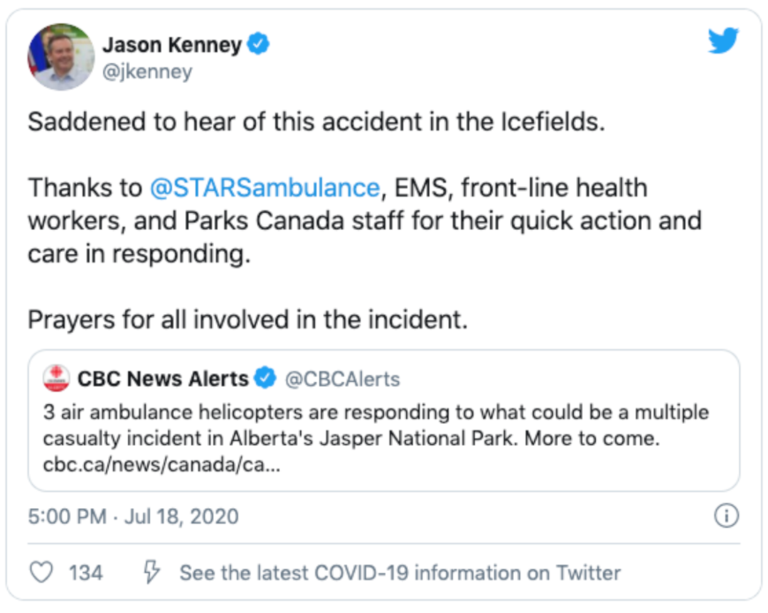 Pursuit公司总裁戴维·麦肯纳(Dave McKenna)周日发表了一份声明:他表示自己向遇难者的家人和朋友最深切的哀悼,向昨天事故中受伤的人员表示最深切的慰问。而且还向加拿大国家公园,包括阿尔伯塔省紧急救护队和他们在哥伦比亚冰原团队的迅速反应表示感谢。