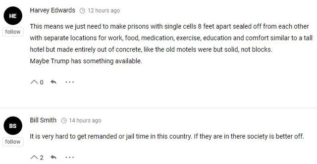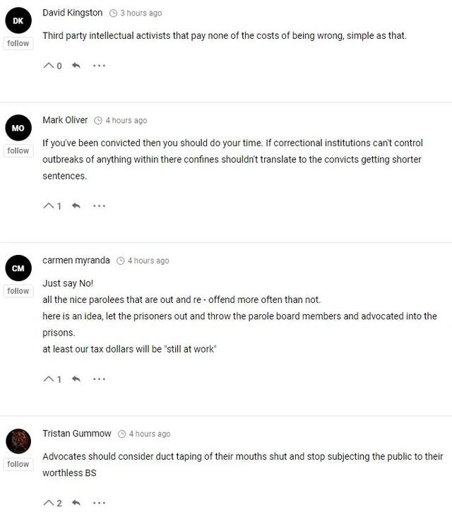 “别做梦了!有太多人假释之后继续犯罪了,我有个主意,让囚犯出来,然后把假释委员会成员和这位平权组织的成员投入监狱吧,这样我们的税金就没有被浪费。”