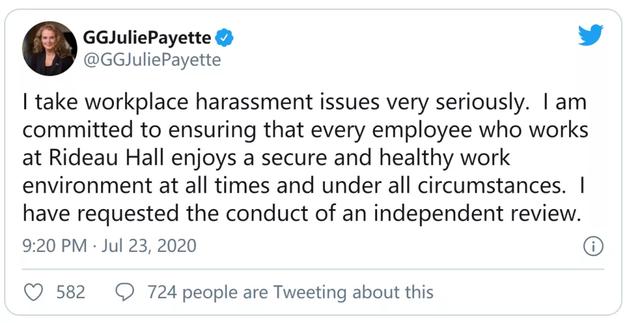 总督Julie Payette发表声明说,对此投诉表示关切,欢迎PCO开展调查,并承诺要确保总督府的工作环境是健康和安全的。