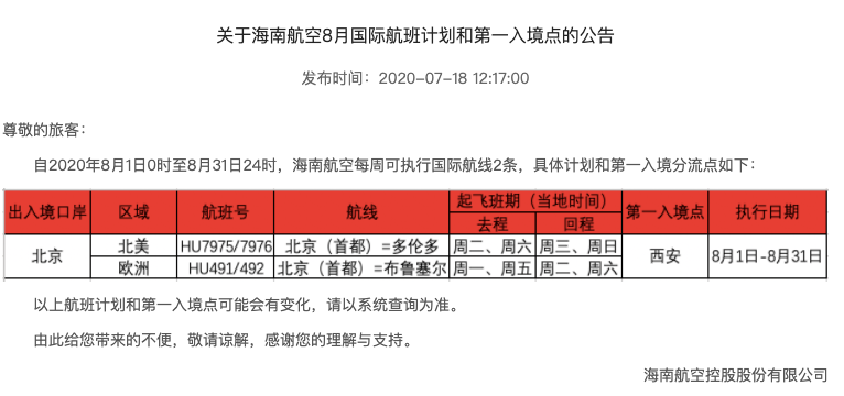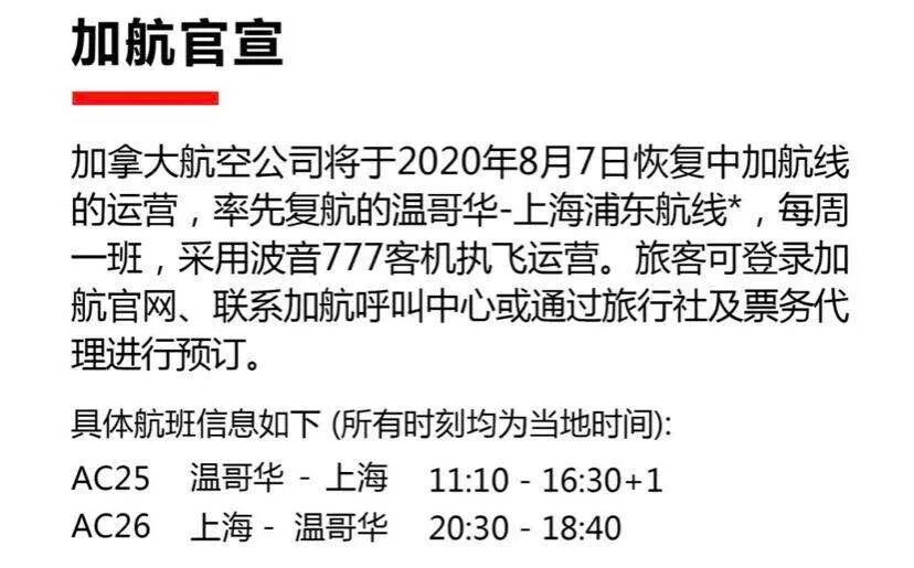 以及上周加航官宣的,从8月7日开始每周一班从温哥华-上海往返航班。