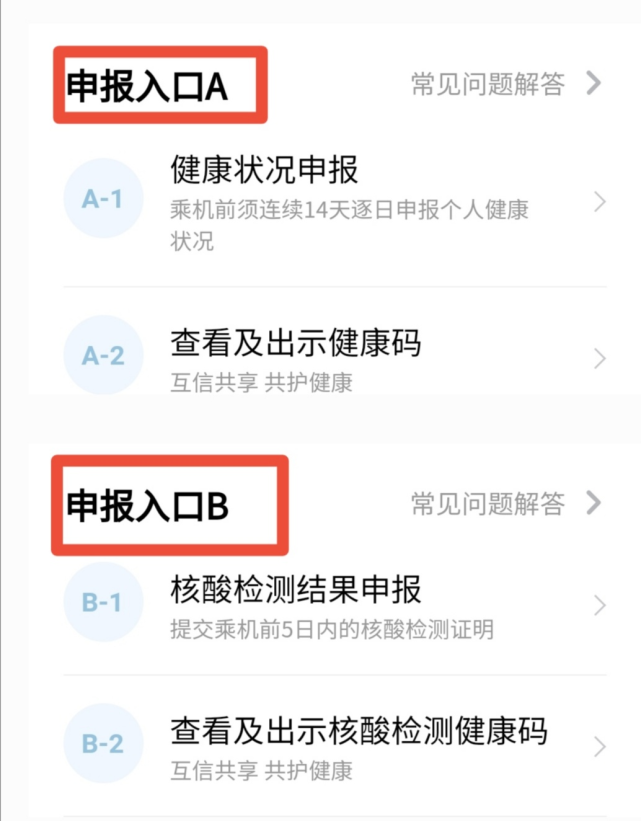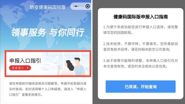 大家根据回国航程以及自身情况,选择适合的申报入口,并填写相关信息,在起飞前保障健康码正常申报,以免耽误行程。健康码入口的选择,可查看健康码申报入口上方的「申报入口指引」,查询后进行判断。