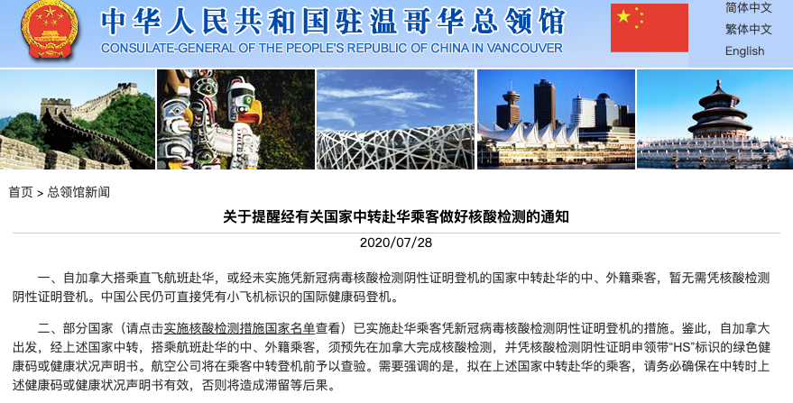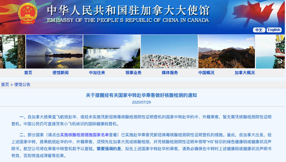 7月29日,中国驻加拿大大使馆发布了一个赴华乘客做核酸检测的通知,给大家带来了一个好消息:目前从加拿大直飞回中国的中国籍、外国籍乘客,暂时无需凭核酸检测阴性证明登机;中国公民仍可直接凭有小飞机标识的国际健康码登机!